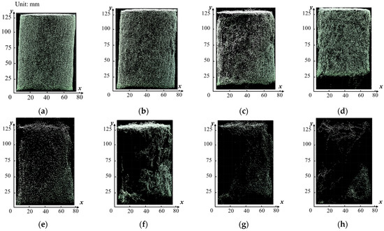 Comparison of the side view of O2 under different POUs. Subfigures (a–h) are the side view of O2 under POU of 556, 278, 168, 111, 84, 56, 28, and 17, respectively.