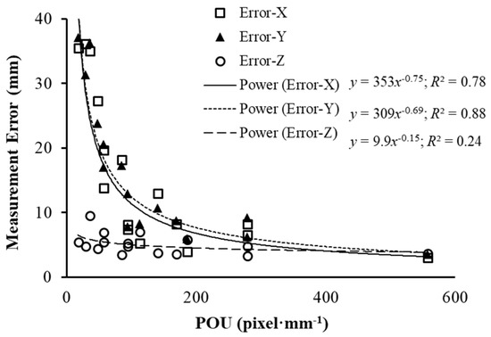 The interaction effect of Ox and Oy was significant on the measurement error, with lower overlap data generating significantly higher error. To quantify the measurement errors due to the SR and overlap, a power regression analysis between average measurement errors of the three shapes and defined POU was conducted and results are shown in Figure 7. The average measurement errors dropped dramatically with the increase of POU. This finding is consistent with the observation by Dandois [22] that the quality of dense point cloud is affected by image overlap and ground sampling distance (GSD), a reciprocal of SR. As defined in Equation (5), POU is a combination effect of both forward and side overlap and SR. High POU represented more overlap and higher SR of the images. The developed regression functions for measurement errors in x and y provided a potential tool to determine the imaging quality in greenhouse and field applications where data are collected using the approach similar to this study. It is also identified that measurement errors in z were constantly low in this study, which might be caused by the better visibility in top surface than those in the side surface. The projected regions of top side were not decreased as sharply as the regions of the side view. Due to canopy height being an important crop trait that has been widely used [2], it proved a strong support for the usefulness of the proposed data collection method developed in this study.