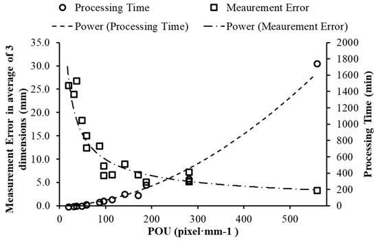 Average measurement error of the three replicates and the processing time of different POUs are shown in Figure 8, which indicates that the measurement error increased, and the processing time decreased with the gradual decrease of POU. The processing time in the highest POU (556 pixel·mm−1 with 90% Ox, 95% Oy and 2.78 pixel·mm−1 SR) was approximately 1800 min (30 h), which is unrealistic for a high-throughput phenotyping imaging system. The second highest POU with 17.6% dense points less than those highest POU as shown in Table 5, had an average of 80% less processing time but only 2 mm more errors (Figure 8).