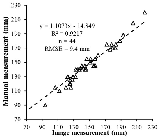 The automated measurement method of height was performed on 44 plants. An ANOVA test (Table 6) shows that there was no significant difference (p = 0.907 at the 5% significance level) between the mean plant height measured with a tape measure and the automated measurement from images. Linear regression analysis showed that the automated measurement methods explained 92% of the manual measurements (R2 = 92%) with a RMSE = 9.4 mm. The reason that the error of image measurements for plants was much larger than that of artificial objects might be that artificial objects were easier to be recognized in overlapped images than plant shoots [23], and there were more errors and bias when manually measuring the top point of plant shoots [3], especially when measuring trifoliolates grown in salt-tolerance varieties which were toward one side of the plant obliquely but not right in the center. This can be seen from Figure 9 that measurement in higher plants had larger error than that in shorter plants that only had cotyledon.