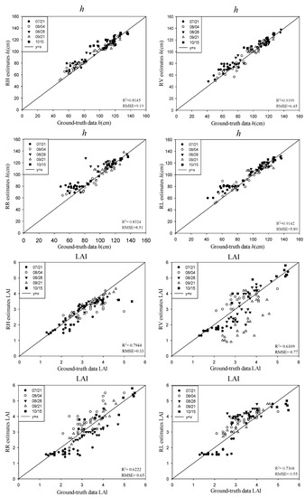 As the CP backscattering coefficients and Stokes parameters are the power of the backscatter wave, they can replace and be expressed as a function of the rice biophysical parameters by substituting Equations (28)–(33) into Equation (27). For each equation for , there is an ill-posed problem. Therefore, it is obviously impossible to solve for four rice biophysical parameters in one equation. Therefore, to solve for one of the parameters, the values of the other three parameters must be assumed to ensure that one equation can be used to calculate the value of a rice biophysical parameter. Taking the seedling stage to the heading stage as an example, we take h as the parameter to be solved, and the other three parameters must be assumed. From the seedling stage to the heading stage, the underlying surface is calm water, so ms is assumed to be 1. The quantity mvh1 for the top layer is related to the wet and dry biomasses of the leaves, which in turn are related to the green LAI [20]. So, we can substitute mvh1 for the LAI in Equations (29) and (32). In each phenological stage, we measured the mv of the sample plots, and the entire image was interpolated by the nearest neighbor interpolation algorithm using the measured mv so that each pixel had a value of mv. So, when every pixel in the image was used Equation (28) to calculate h, the mv was replaced by corresponding value. Therefore, an unknown parameter (h) has only one equation to solve for h. When solving for other parameters, such as the LAI, we assume that the other three rice parameters are specific values according to the same method so as to effectively solve for the LAI.