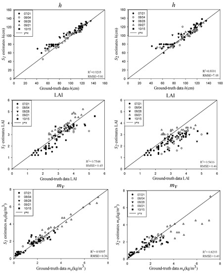 Figure 8 shows the estimated results of the rice biophysical parameters using the Stokes parameters (S1 and S2) and the validation with the ground truth data. In general, similar to CP backscattering coefficients, the inversion results of h and mv were superior to those of De and the LAI, when the Stokes parameters (S1 and S2) were used. The R2 for h and mv were both above 0.85, and the RMSEs were less than 8 cm and 0.49 kg/m3, respectively. This indicated that the Stokes parameters (S1 and S2) were more sensitive to the rice height and the VWC of the rice canopy compared with the LAI and De. In addition, based on the equation of the water cloud model and the idea of establishing the water cloud model, h and mv contributed a lot to the model, which also led to the high precision of the inversion of h and mv. Among the Stokes parameters (S1 and S2), S1 had the best performance in the inversion of h and mv. As can be seen from the above Equations (14) and (15) and Figure 4, S1 contained multi-polarization characteristics, which contained more energy than S2. The preferable results with S1 were mainly due to its sensitivity to the total scattering of the rice canopy. For the inversion of De, S1 got the accuracies of R2 of 0.79 and RMSE of 0.21 kg/m3, much better than that of S2 with a R2 of 0.41 and a RMSE of 0.27. The main scattering energy of the rice ear came from its volume scattering, indicating that S2 was not as good as S1 in the characterization of volume scattering characteristics. Especially on 21 September and 15 October, for the inversion of De, the points of inversion results deviated from the line “y = x” significantly, which meant that the accuracy of S2 was far less than that of S1 in the dough stage and the mature stage. Compared with h, mv, and De, the LAI had the poorest inversion results when using the Stokes parameters (S1 and S2), of which S1 was the best for the retrieval of the LAI, with a R2 of 0.75 and a RMSE of 0.45.