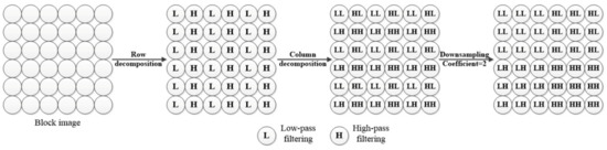 Step ②: Detect the homogeneous regions of every block in the wavelet domain. Owing to the good performance of detecting the homogeneous region in the wavelet domain in [1], each block image is decomposited into four sub-band images LL, HL, LH and HH, as shown in Figure 2.