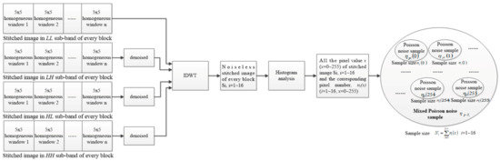 It can be seen from Figure 5 that the histogram analysis offers the pixel value x (x = 0~255) and the corresponding pixel number (denoted as ni(x) (i = 1~16, x = 0~255)) of every noiseless stitched image (denoted as Si (i = 1~16)). Because the parasitic Poisson noise is signal-dependent and , as shown in (1), the Poisson noise samples (i = 1~16, x = 0~255) and the corresponding sample size ni(x) (i = 1~16, x = 0~255) can be obtained according to histogram analysis. All the noise samples constitute the mixed Poisson noise sample (i = 1~16) corresponding to Si (i = 1~16) and the sample size of can be represented as Ni (i = 1~16). As a result, (i = 1~16) and the unbiased estimations of the mean of (i = 1~16) can be obtained as (6).
