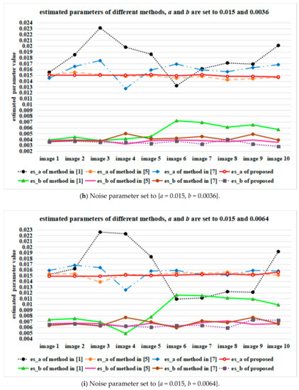 Figure 7 and Figure 8 clearly show that the estimated value of parameter a processed by the proposed method is closer to the preset parameter than that processed by other methods, even when the Poisson noise component is strong. On the contrary, the proposed method obtains comparable results to those of the other methods when the Gaussian noise component is strong.