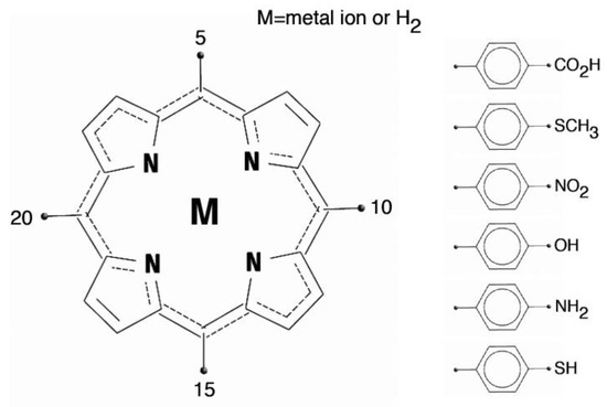 15]. The structure of a generic porphyrin and the porphyrin macrocycles with a set of common meso (5, 10, 15, and 20) aryl derivatives are shown in