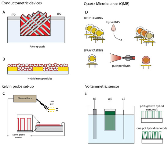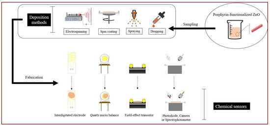 21], ZnO NPs functionalized with porphyrins are layered onto interdigitated electrodes and the change of resistance is measured after exposure to several volatile organic compounds (see