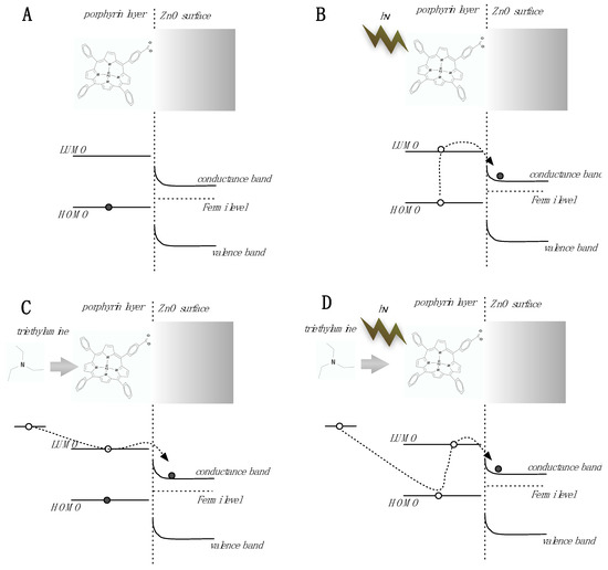 Figure 3. As known by the numerous studies on dye sensitized solar cells, porphyrins can transfer photo-electrons towards the ZnO increasing the conductivity and decreasing the surface band bending. The same mechanism can also be activated by an absorbed electron donor molecule. Under visible light, the highest occupied molecular orbital (HOMO) level of porphyrins is almost depleted of electrons and then the transfer of electrons from the absorbed molecule is expected to be more efficient. Eventually, under visible light the sensitivity increases and, most interestingly, the sensitivity towards electron donor species (e.g. amines) is enhanced. It is important to note that this effect is expected for Lewis basis.