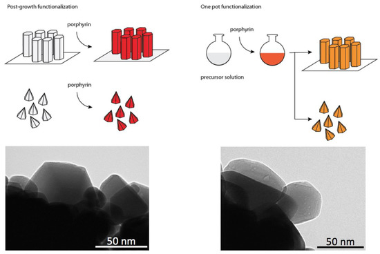 Optical measurements show that in one-pot prepared materials, porphyrins are less aggregated with respect to the after-growth coating [