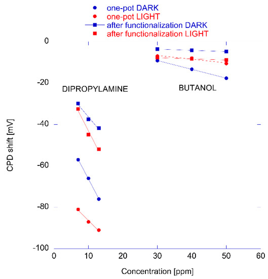 Figure 6 shows the change of CPD at different concentrations of dipropylamine and butanol measured in dark and light conditions. The different behavior of the two materials can be appreciated in the plot, and in particular note that the largest difference is between light and dark shown by one-pot prepared material in the case of the electron donor compound (dipropylamine in this case). The responses to butanol are practically unchanged by the exposure to light, indicating that the sensing mechanism in this case does not involve the electron transfer but rather the CPD is due to the surface electric dipole due to the layer of adsorbed alcohol.