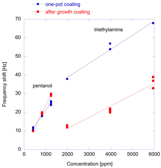 24]. In this paper, 3 QMB sensors (each 20 MHz AT-cut crystals) were prepared with a porous porphyrin layer and ZnO nanoparticles functionalized with after-growth and one-pot growth methods (see