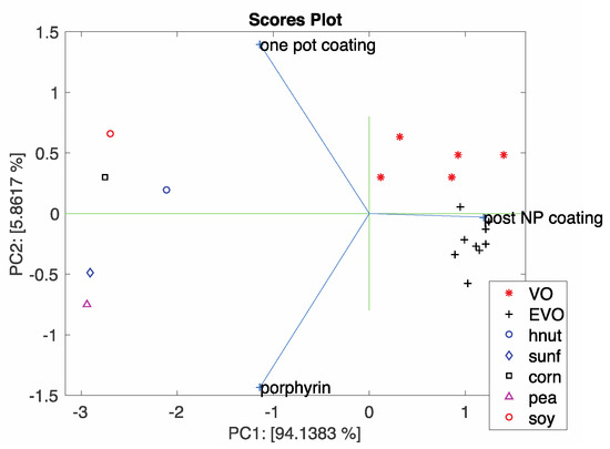 Figure 8. The figure shows the bi-plot of the principal component analysis of data related to different vegetable oils. Analysis of loadings show the mutual information provided by the three sensors. In particular, post-coated nanoparticles are oriented towards olive oils while porphyrin-films and one-pot prepared materials are oriented towards oils of different origins.