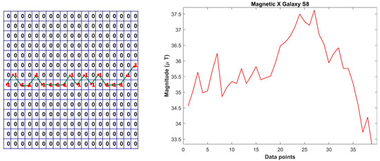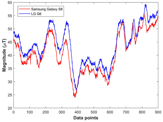 Previous studies [12,13] show that various devices measure different values for the magnetic field strength of the same place, which is confirmed by our experiment. Two different phones, Samsung Galaxy S8 and LG G6, are used for the experiment. Figure 2 corroborates that different devices show different behavior along the same path at the same time.