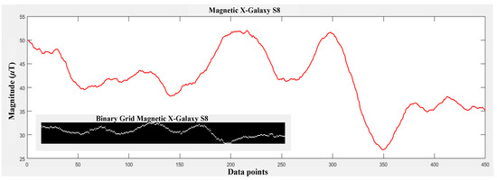 First, a matrix containing zeros of M × N size is declared where M is number of rows and N is the number of columns. Then, each magnetic data point is taken and converted to a row number by subtracting it from the maximum data point and rounding it. Afterwards, a 1 is added to the calculated row and this process is repeated for all the data values. The BG shown in Figure 7 (left) is for the first twenty values only of the graph shown in Figure 7 (right), while Figure 8 shows the magnetic x axis for Galaxy S8 and its associated BG.
