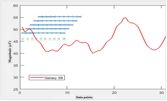Toy example: Let us say that we have user taken geomagnetic values given in Figure 8; the blue bars on the figure show the size of the frame taken for pattern matching. After the first iteration of the inner loop given in Algorithm 2, we have ten geomagnetic positions and ten distance values for the same frames. Now, we assume that each geomagnetic position is a correct estimate and adjust its preceding and conceding positions with the help of the acceleration distance we have. For example, for set of geomagnetic position estimates and set of distance data, the set of candidate positions is calculated as: