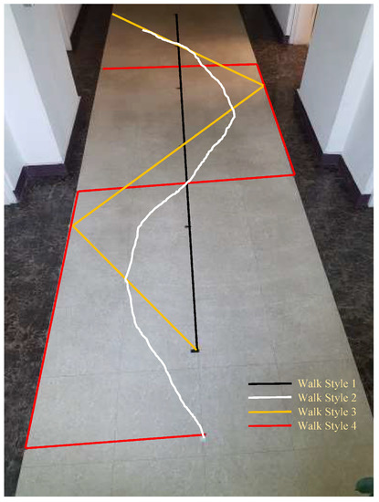 To check the performance of the system in more realistic and complicated environments, we adopted four different walking styles, as shown in Figure 15. The first walking style is to follow the straight path, as shown in Figure 12, Figure 13 and Figure 14, and it includes few turns. The second walking style is a semi circular path where the user follows a zigzag path while the third walking style is a triangular shaped path where the user walks across the straight line path at specified points. The last walking style is more complex than the previous three and it includes many turns along side the path at specified marked points. The points on the floor show the ground truth values and are used to evaluate the accuracy of localization.