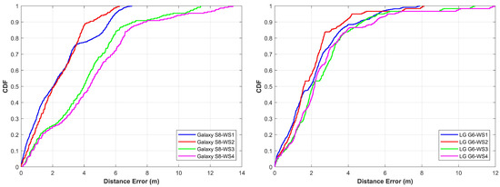 The results for IACT building Floor 3, as shown in Figure 18, are better than EE building. The error for Samsung Galaxy S8 is 2.05 m 50% of the time while it is 1.94 m for LG G6. The mean and maximum errors are also less in this case than that of the previous case. The maximum errors are 7.02 m and 7.88 m for Galaxy S8 and LG G6, respectively. The performance of the proposed method lies in three underlying factors. First is the size of the window that is used for the experimentation. It is possible to get incorrect locations even with pattern matching if we use few frames of magnetic data, however, the use of taking more frames ensures more consistent location results. Second, on many occasions, we get very dissimilar results for matching more than one frames pattern against pattern database but the technique of generating the possible localization candidates secures the closest localization points to the ground truth. The last is the use of more than one windows which are intentionally separated by exactly one frame. Since we know the average distance traveled by the user in one frame, we use it to infer the next correct location and remove the outliers.