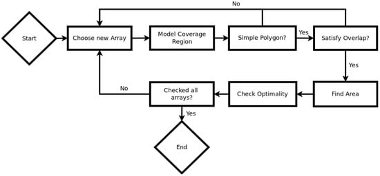 The general flow of our optimization algorithm. For each possible array, we model the coverage region, check to see that the result is a simple polygon which satisfies the overlap constraints, then find the area and compare that to the previously maximum area array.
