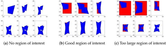 First, A region of interest (RoI) can be used to try and focus the FoV on the portions of the scene that need to be covered. Rather than simply maximizing the total size of the coverage region, we instead define a space that we wish to cover and maximize our coverage of that region. This method is sensitive to the choice of RoI. As can be seen in Figure 5, different choices of a region of interest can result in very different coverage regions and having a region that is too large or poorly shaped to be covered by the array given camera placement constraints can be just as bad as having no region of interest.
