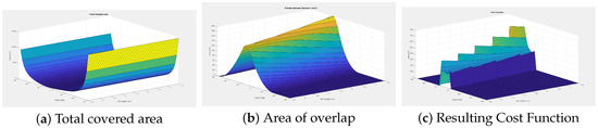 Applying the model to a set of five cameras placed symmetrically on the trocar camera array shows the following: (a) the area of the union of the fields of view; (b) the area of overlap between Cameras 1 and 2; and (c) the cost function that results from thresholding the overlap between each pair of cameras.