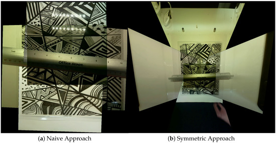 Applying symmetric optimization to create camera arrays for use in a laparoscopic trainer box can give significant improvements in total visibility for tasks in the box: (a) a frame from the original naive camera system; and (b) a similar frame from our symmetrically optimized camera system. The optimized system gives us near complete coverage of the test box. No blending techniques were applied so that the individual camera views can be easily picked out from the mosaic.