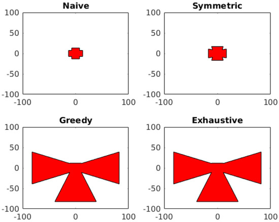 While the maximal area approach unsurprisingly achieved a larger area than the maximal convex region approach and the resulting coverage region is nicely symmetrical, as we can see in Figure 5, removing the region of interest can cause the construction of the array to become very irregular and it would not be very useful for most mosaicking applications. However, even a poorly matched region of interest does a good job making an array which has a much larger field of view than the naive approach. However, the array coverage may be deceptively large as the result consists of three major regions that are only connected to one another by a very small region.