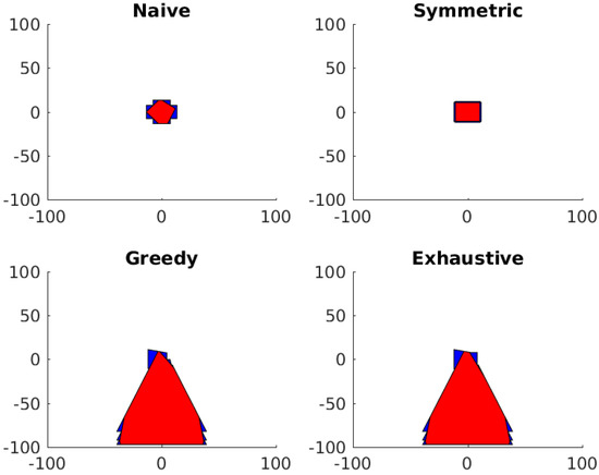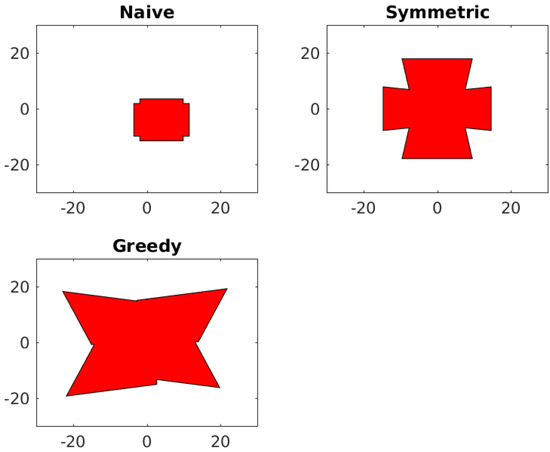 Next, the constrained system for the surgical camera array is evaluated for the maximal convex region rather than the maximal area region. The resulting regions can be seen in Figure 11 and the resultant area comparison can be seen in Table 3.
