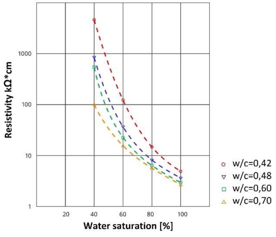 Previous studies show that electrical resistance can be used to measure the humidity of concrete and masonry walls [10,11,12]. There is a known relationship between moisture inside a porous building material and its electrical resistivity (Figure 2). Similar relationships can be observed for a brick wall and a lightweight concrete blocks wall. The electrical resistance increases as the moisture content decreases. It can be seen that the smallest change in resistance occurs in the highest range of moisture content. Although current techniques for measuring moisture in concrete and brick walls are accurate, the use of electrical resistance has the advantage of being a relatively simple procedure that can be used with inexpensive equipment [13].