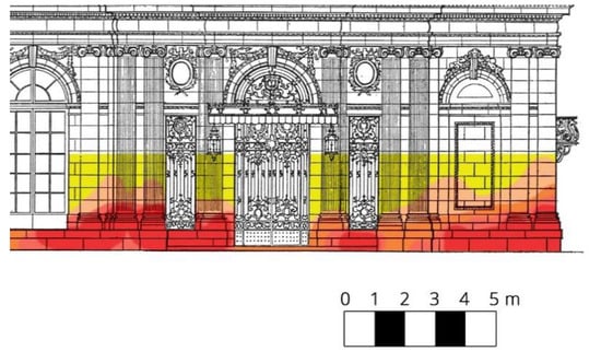 An image of building walls’ dampness developed on the basis of the results of an electrical test. Higher moisture concentrations are depicted by a color of higher intensity [17].
