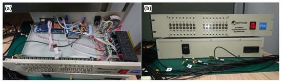 The data collection system collects the measured voltage from the electrodes and then processes the data. Conventional data acquisition systems require voltage, filtering, demodulation and converting equipment to be digitized and a signal processor to transfer data to a computer. Our device for measurement in electrical tomography uses two methods: electrical capacitance tomography and electrical impedance tomography. It allows you to take measurements up to 32 channels. Figure 4a shows the inside of the tomograph, while Figure 4b shows the main panel of the device with sockets designed to connect the electrodes. This device provides a non-invasive way to test the spatial distribution of moisture. The system includes an additional software solution. The advantage of the system is the simultaneous measurement of voltage and capacitance.