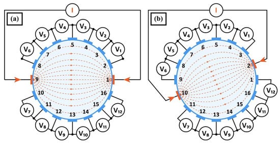 Input data for the image construction algorithm are voltage measurements made between adjacent electrodes. Measurements made on electrodes with an attached excitation source are omitted due to unknown voltage drop between these electrodes and the tested area. For a system of n = 16 electrodes and any projection angle, n − 4 = 12 independent measurements can be obtained. Thus, the full number of voltages measurable between neighboring voltage electrodes at n/2 = 8 angles is: (n − 4) (n/2) = 12 × 8 = 96. The method of measuring the inter-electrode voltages shown in Figure 5 corresponds to the first and the second projection angle. For subsequent angles, sequential switching of the power supply and measurement circuit to the neighboring electrodes takes place.