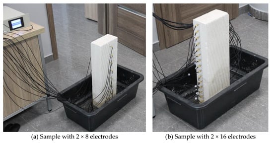 The tested physical models of the wall parts contained 16 or 32 electrodes each for measuring the wet wall. The electrodes were placed on both sides of the tested wall sample. Electrical impedance tomography is based on the measurement of the potential difference. The ability to determine the wall condition results from the unique conductivity value of each material. The necessary equipment such as electrodes, meters, alternating current generator, multiplexer and a computer with LabVIEW and EIT modules was used for the measurements. Figure 6a,b shows the partially immersed lightweight concrete block on which the surface electrodes are placed. It can be seen that in the presented picture the block samples have 2 × 8 (a) and 2 × 16 (b) electrodes.