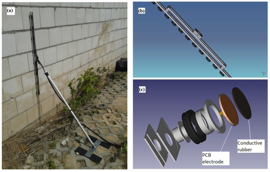 The concept of the electrodes: (a) way of fixing rubber electrodes to the building wall, (b) set of rubber electrodes, (c) structure of a single rubber electrode.