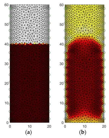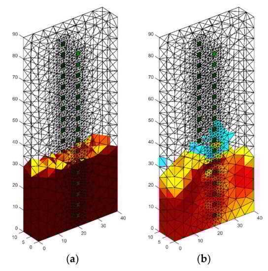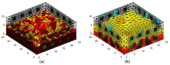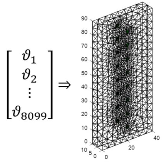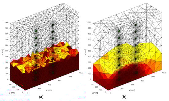 In Figure 10, we can see an example of a reconstruction of a damp concrete block using 32 electrodes located on both sides of the tested object. In order to solve the problem of the three-dimensional finite element, mesh was prepared. It can be noticed that surfaces of finite elements that are localized near electrodes are small. Hence, the solution of the forward problem is precise. The results obtained are similar to those obtained by placing 32 electrodes around the lightweight concrete block with dimensions 10 × 40 × 90 cm. The reconstructed image deviates from the pattern with the too low intensity of colors.