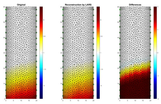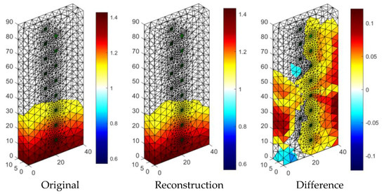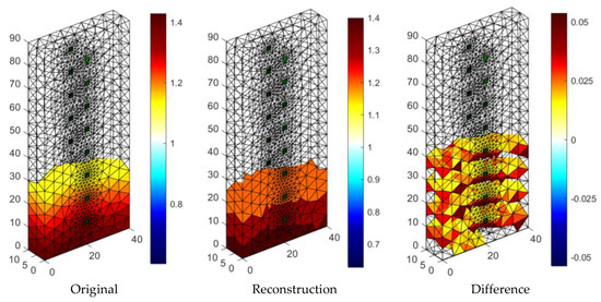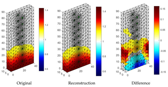 Figure 15 presents one of the results of tomographic imaging using the LARS method. The input data was obtained thanks to the use of an EIT tomograph equipped with 16 electrodes (2 × 8). Intense colors indicate areas with higher humidity. It can be seen, the obtained reconstructive image (in the middle) is very close to the reference image (left). The difference image (right) indicates small deviations of the grid points in the reconstructed image from the reference image. The colors in the images reflect the conductance of the individual pixels that each image consists of. The lack of color in the original and reconstruction images testify to the lack of moisture. RMSE for a 3D sample with the use of LARS is 0.0298.