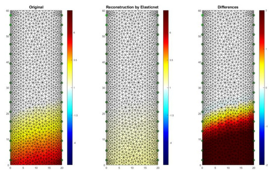 Figure 18 presents an example of a tomographic imaging result using the ElasticNet method. The input data was obtained thanks to the use of an EIT tomograph equipped with 32 electrodes (2 × 16). Intense colors indicate higher humidity spots. It can be seen that the obtained reconstructive image (middle image) reproduces the reference image (left) poorly. The image of differences (right) indicates the occurrence of significant deviations of the grid points of the image reconstructed from the reference image. RMSE for a 2D sample with the use of ElasticNet is 0.282520. Compared with LARS, ElasticNet showed the lower quality (higher RMSE) of reconstruction in this case.