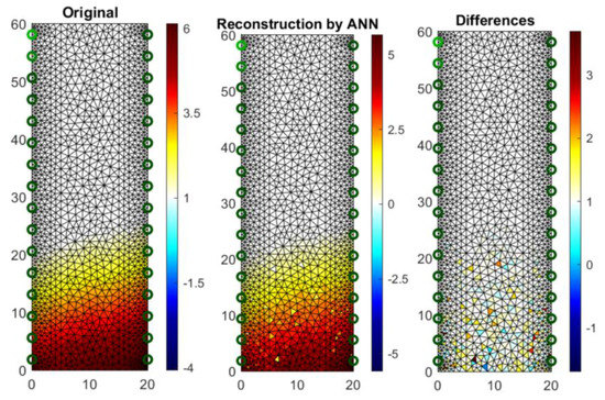 Figure 19 presents the results of neural imaging in conjunction with the EIT. Conductive (positive) areas are shown in shades of red. Non-conductive (negative) areas are shown in blue or they are transparent. Comparing the pattern of the damp block (original) with the output image, we conclude that the accuracy of the imaging is very high. The right image shows the absolute (numerical) differences in the values of individual pixels are minimal. They do not exceed ±0.05. It can be seen that the results obtained by the neural imaging method are comparable to the results obtained by both previous methods. RMSE for a 3D sample with the use of ANN is 0.010819 so the quality is better than LARS and ElasticNET.