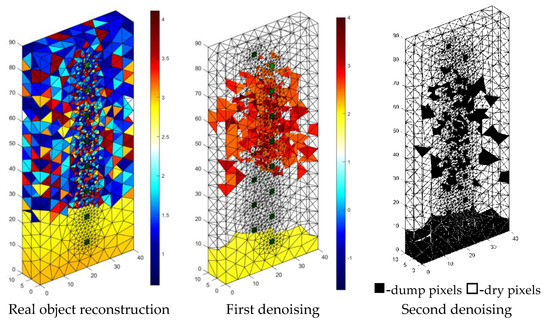 To show the results in a way that visually identifies the moisture area, the input vector was subjected to a denoising procedure using denoising stacked autoencoders [38]. The results of denoising were presented in the middle image entitled “First denoising.” Finally, the output image was subjected to one more processing using a filtering script whose objective was to cut off the output values, which obviously exceeded the acceptable range. The filtering effects are shown in the image entitled “Second denoising.” Finally, it was possible to reduce the number of incorrectly reconstructed pixels in the central part of the sample, but it was not possible to obtain a “clean image”.