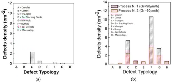 SiC epitaxial layers are typically characterized by different types of surface defects, such as carrot defects [14,15,16], pit defects [17,18], triangular defects [19], down-fall, and other typologies [20]. The formation mechanism of these defects is not completely known, but it is clear that they are due to unoptimized growth conditions, because their density is correlated to substrate crystal quality and to the growth conditions. The presence of macroscopic defects has an influence on the leakage current and on the blocking voltage of a device [12], determining an increase of the former and a reduction of the latter in conditions of high defect density.