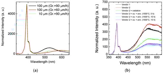 (a) Room-temperature micro-photoluminescence analysis on 100 µm 4H–SiC epitaxies grown with two process typologies (at 90 μm/h and 60 μm/h) and 10 µ; (b) room-temperature photoluminescence (RTPL) analysis on semi-insulating substrates for E detector, after oxidation and thermal treatments at 1500 °C for different annealing times.