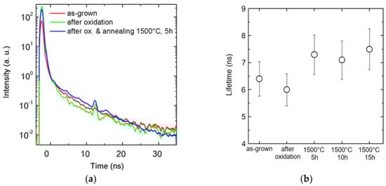 (a) Time-resolved photoluminescence (TRPL) analysis on semi-insulating substrates, for E detector, after oxidation and thermal treatments at 1500 °C for different exposure periods. TRPL spectra (a) and lifetime values obtained (b).