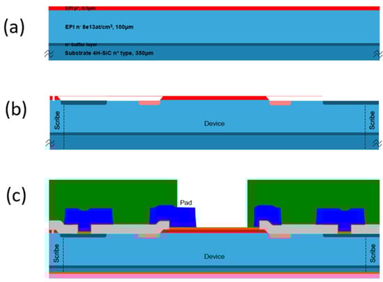 The first step of the processing is the epitaxy of the double layer necessary for the p+/n junction. A p+ layer 0.3–0.5 µm thick with a doping concentration of the order of 1018–1019/cm3 was grown over the n− epi-layer with a doping concentration in the range of 5–8 × 1013/cm3 (Figure 4a). After this step, a first photolithography for the definition of the detector area by a plasma etching was performed. Then, a second lithography was performed for the construction of the edge structures aimed at reducing the electric field at the device borders. In particular, these edge structures were performed by ion implantation at a temperature of 400–500 °C followed by high-temperature annealing (1600–1800 °C) to recover the crystalline structure of the SiC implanted regions (Figure 4b) or using a metal field plate or finally using several floating rings realized with the p+ epitaxial layer. All these structures were realized on the same wafers to compare the breakdown of efficiency of the different structures. Even different implantation doses have been tested to see the dependence on the dose of the breakdown voltage.