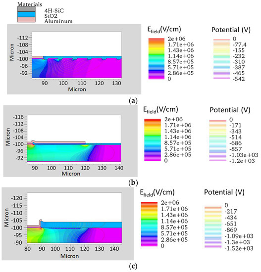 (a) Simulations of the edge structure with 16 epitaxial rings; (b) with field plate; (c) with p− implanted ring. All the edge terminations have been optimized for 100 μm epi thickness but are shown for the 10 μm epi layer, close to the breakdown voltage.