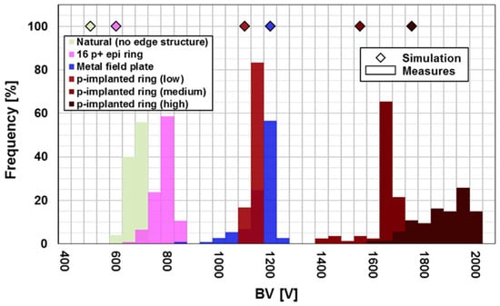 From the first results shown in Figure 7, it is possible to observe that the simulated breakdown voltages (BV) of the different edge structures are in good agreement with the experimental results. For the case without edge structure and the one with 16 p+ epi rings, the disagreement is probably due to the particular etching profile of the p+ epi layer that was not perfectly simulated. Moreover, the distribution of the breakdown voltages for the different structures seems extremely narrow with the only exception being the p− implanted ring with the highest dose.