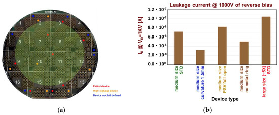 (a) Image of a typical wafer with the indications of the failed and of the high-leakage devices. The majority of the failed devices are on the edge of the wafer where the majority of defects are present; (b) the leakage currents of the good devices do not show any dependence on the particular edge structure.