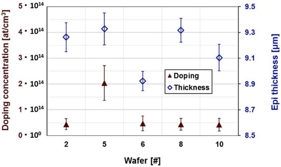 Finally, the thickness and the doping of the epitaxial layers were measured on the different wafers by C–V measurements (Figure 9). The results show a good uniformity and reproducibility of the doping at these low concentrations and a good uniformity and reproducibility of the thickness.
