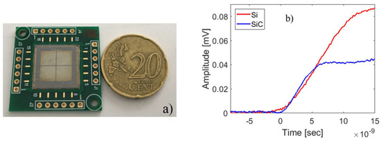 (a) Image of large area 100 µm SiC detectors; (b) signals at the output of preamplifier for silicon and SiC detectors.