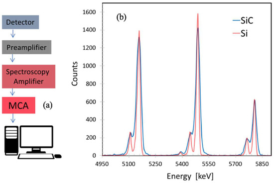 (a) Spectroscopic electronic chain used for the detectors test; (b) energy spectrum of alpha source (239Pu, 241Am, 244Cm) measured by Hamamatsu S3590 Si detector and by our SiC prototypes. The average energy spread obtained for the Si detector is of the order of 0.22%, while we obtained about 0.4% for SiC.