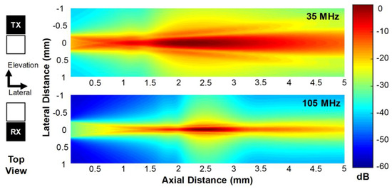 Transmit (TX) beam profile generated by the 35-MHz element (upper) and receive (RX) beam profile by the 105-MHz element (lower), which were obtained by the Field II simulation.