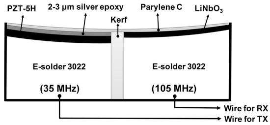 Based on the simulation results, we designed the structure of a dual-element focused IVUS transducer as shown in Figure 3. For the 35-MHz element, PZT-5H (3203HD, CTS Technology, Sparta, IL, USA) was chosen as an active material, whereas lead-free single-crystal LiNbO3 (Boston Piezo-Optics, Bellingham, MA, USA) was used for the 105-MHz element. Note that LiNbO3 was selected to prevent the electrical impedance of the 105-MHz element from becoming too small to be driven because the clamped dielectric constant of LiNbO3 is lower than that of PZT-5H (i.e., 27.9 vs. 1200). As a backing layer, conductive epoxy (E-solder 3022, Von Roll USA Inc., Schenectady, NY, USA) was chosen for easy connection between the piezoelectric materials and signal wires. For the 35-MHz element, two acoustic matching layers were employed. The theoretical optimum acoustic impedances of two layers can be calculated by [23]